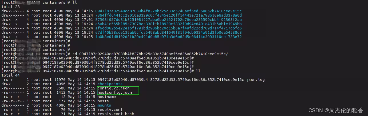 - **config.v2.json:**Docker容器的配置文件之一,包含了容器的配置信息,如环境变量、端口映射、卷挂载点等。版本2表示这是Docker引入新配置格式后的文件。